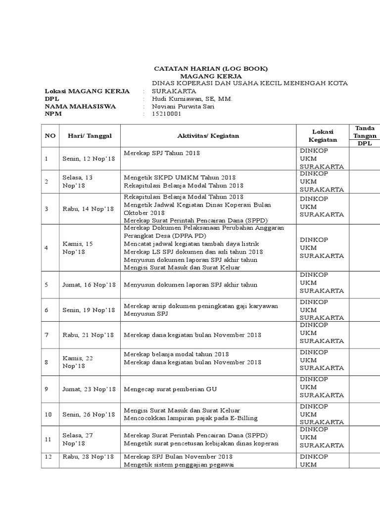 Demikianlah beberapa ulasan artikel tentang contoh logbook karyawan yang dapat Anda jadikan referensi untuk mengetahui lebih jauh mengenai contoh logbook karyawan. D Telah mendapatkan persetujuan dari dosen pembimbing. Saribhakti mampu membuka lapangan pekerjaan untuk warga RT 03 baik dari segi bulanan.